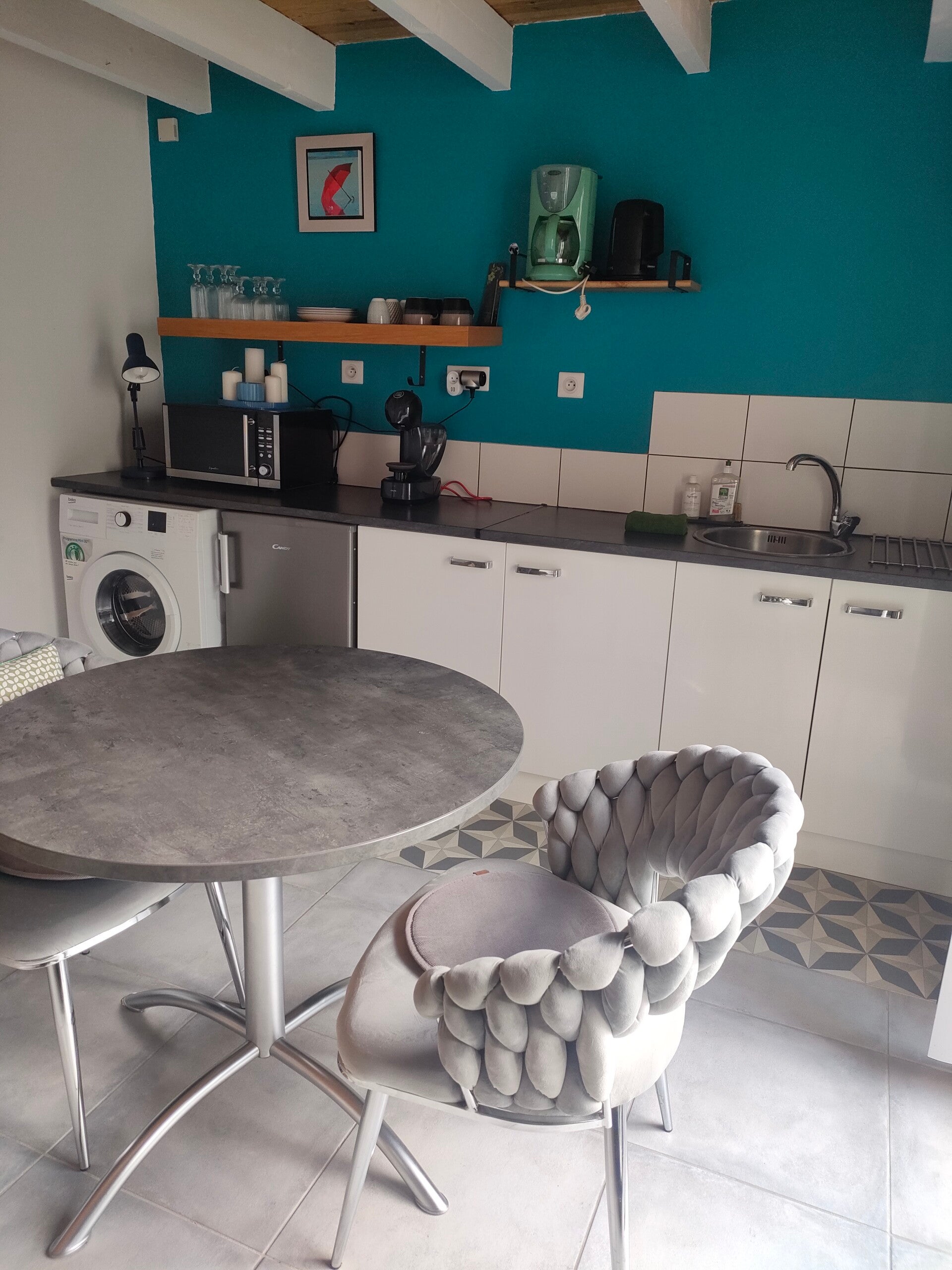 La cuisine est équipée de 2 plaques de cuisson, d'un micro-ondes grill, d'un frigo avec freezer, d'un lave-linge, d'une cafetière, d'une machine à café, d'une bouilloire, d'un grill pain et d'un téléviseur. Un plateau de courtoisie vous attend à votre arrivée (thé, café, tisanes, eau minérale, biscuits).